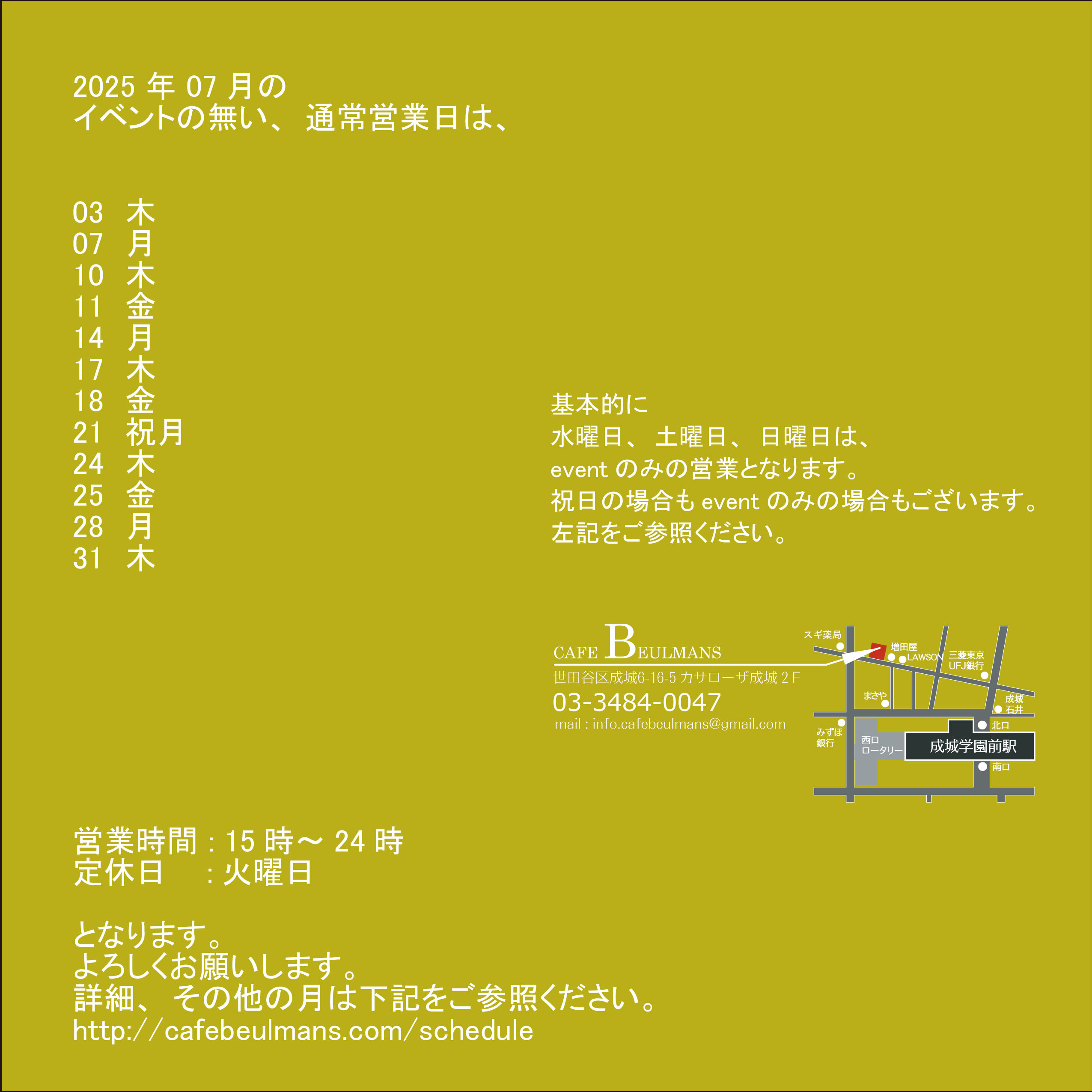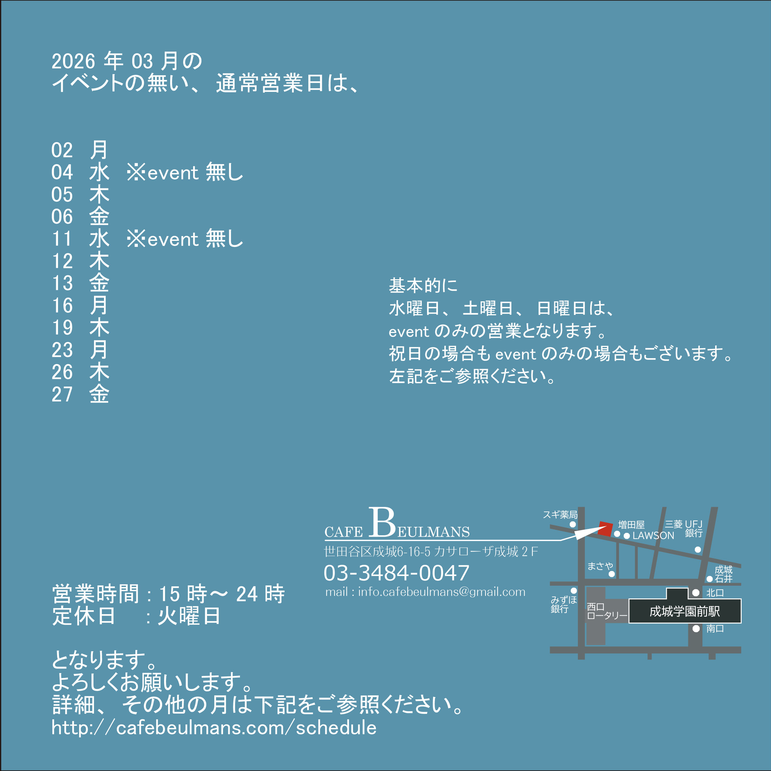 MAIL : info.cafebeulmans@gmail.com (※アドレスは、infoも含みます)