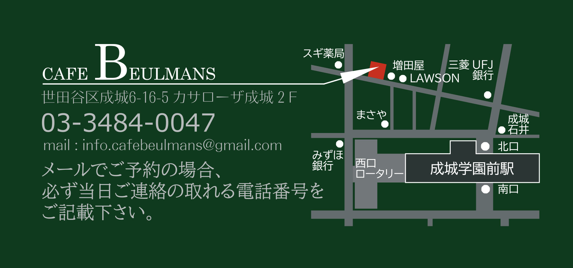MAIL : info.cafebeulmans@gmail.com ※info.もメールアドレスに含みます。